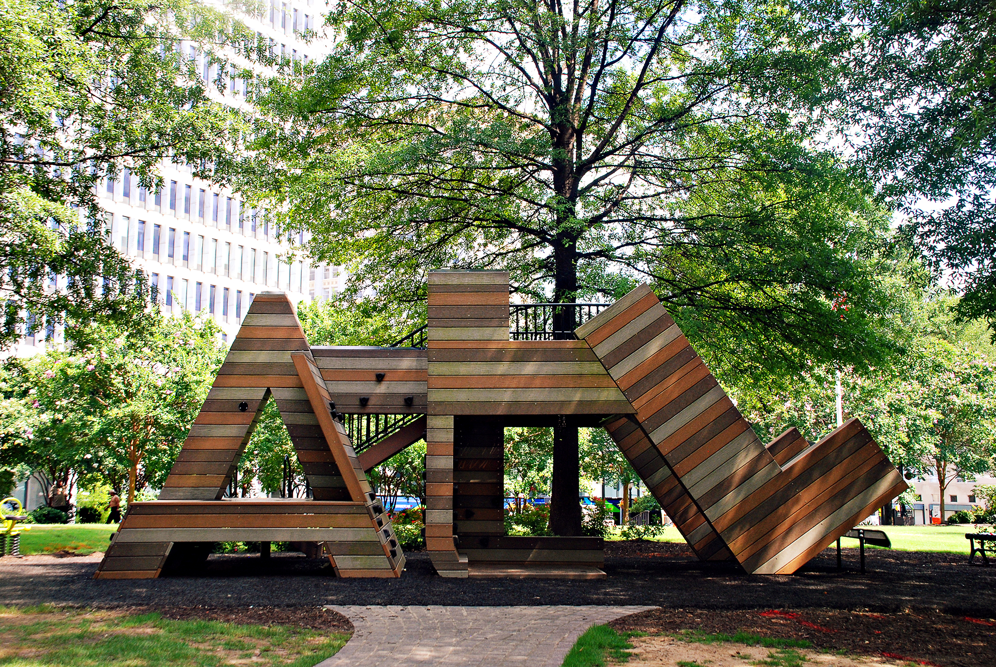 The ATL at Woodruff Park is cleverly disguised as art. This cool sculpture hides a climbing wall, slides and even monkey bars inside its cool facade.