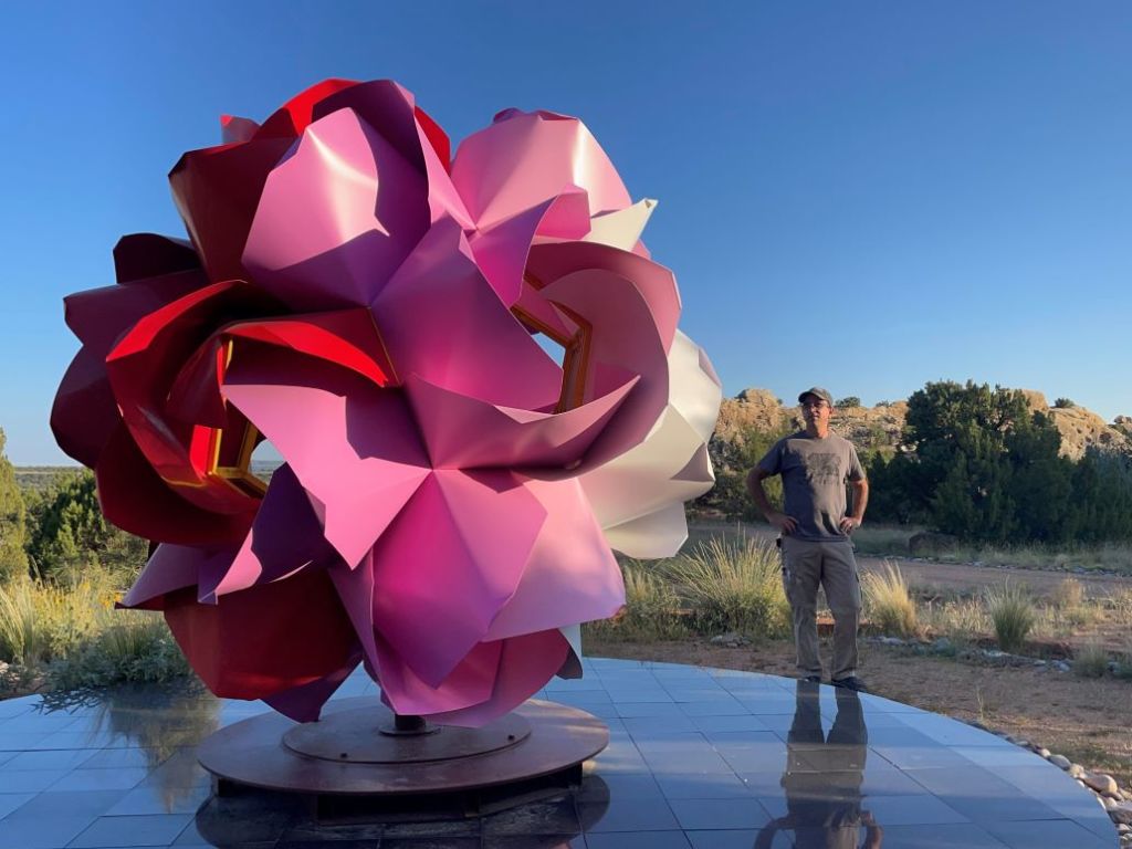 All of the sculptures are larger than life — some more than 20 feet tall. Each is based on a prototypes created with origami – one folded sheet of paper with no cuts. Among the sculptures are flying birds, emerging butterflies, grazing deer and floating boats. “Master Peace” is a 25-foot-tall sculpture of hundreds of stainless steel origami peace cranes towering over Howell Fountain.